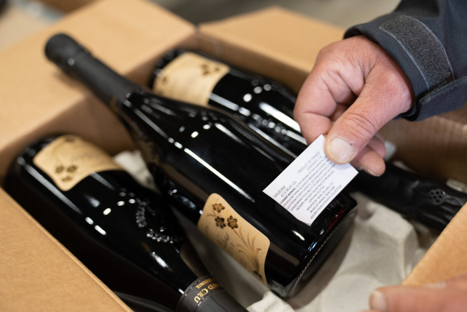 Medewerker is in het warehouse wijn aan het verpakken